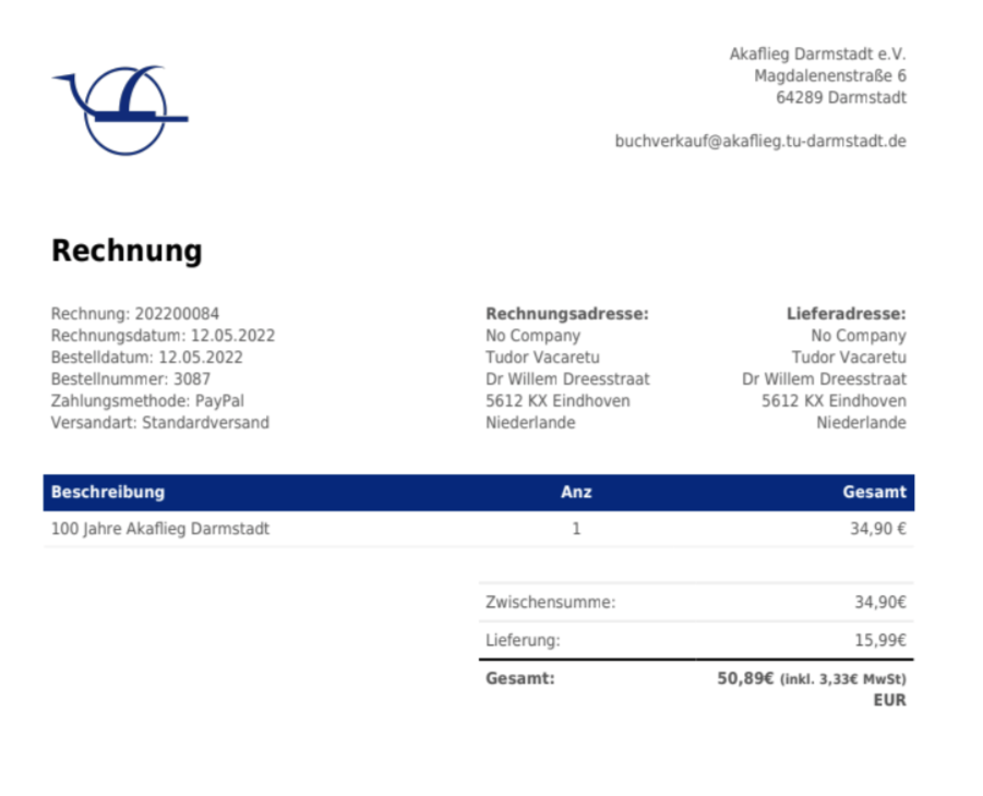 Hallo, Vor ungefähr zwei Wochen habe ich ein Buch (100 Jahre Akaflieg Darmstadt) auf Ihrer Website bestellt. Ich habe das Buch noch nicht erhalten. Wurde es dir zurückgegeben? Ich habe die Rechnung geprüft, und die Adresse enthält keine Hausnummer, daher wird sie wahrscheinlich an Sie zurückgeschickt. Dies liegt daran, dass die automatische Vervollständigung auf dem Website-Formular einen kleinen Fehler aufweist und obwohl die Hausnummer vorausgefüllt ist, speichert das Formular sie nicht. Siehe Anhang. Meine Frage ist, wie können wir dieses Problem jetzt lösen? Sind Sie bereit, mir das Buch erneut zuzusenden? Mit freundlichen Grüße, Tudor Vacaretu.
