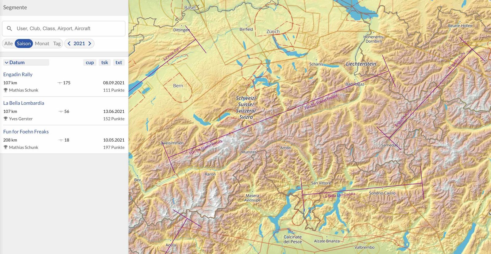 If we switch the date filter to the 2021 season, we see that in this period, Engadin Rally has been flown 190 times. We also see that for 2021, Mathias is now the leading pilot, scoring 111 points on this segment. We can also select individual days or months.