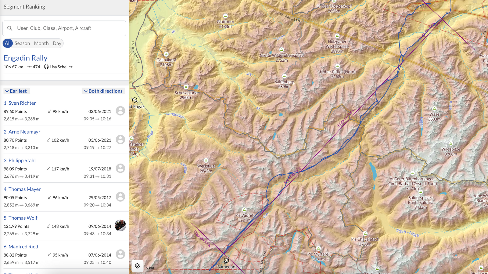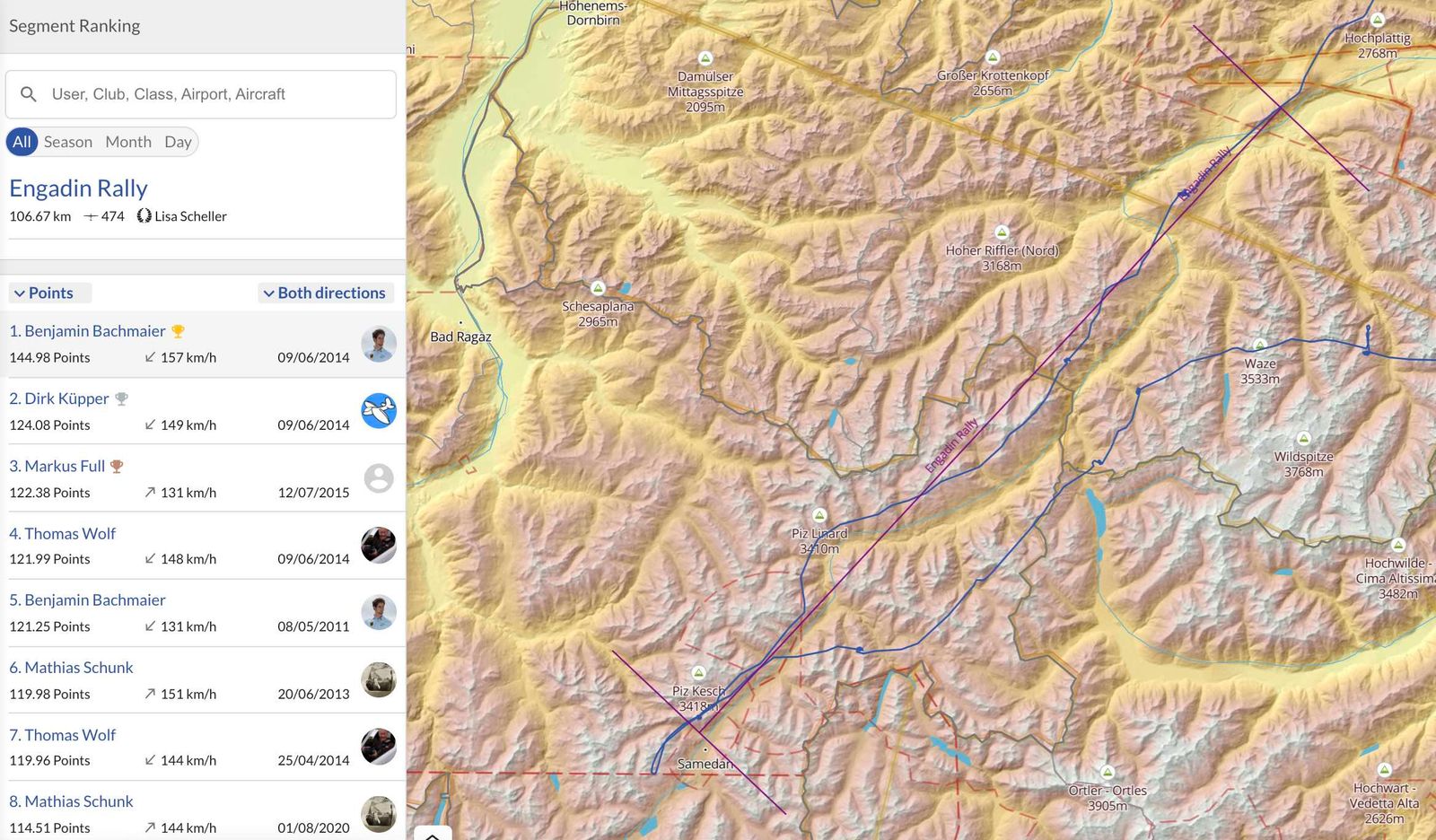 Let's have a look at the ranking for Engadin Rally. Next to the name of the segment, we see the distance, the number of times the segment has been flown, and the name of the local legend. The local legend is the person who (in accordance with the filters set) has flown the segment the most often.