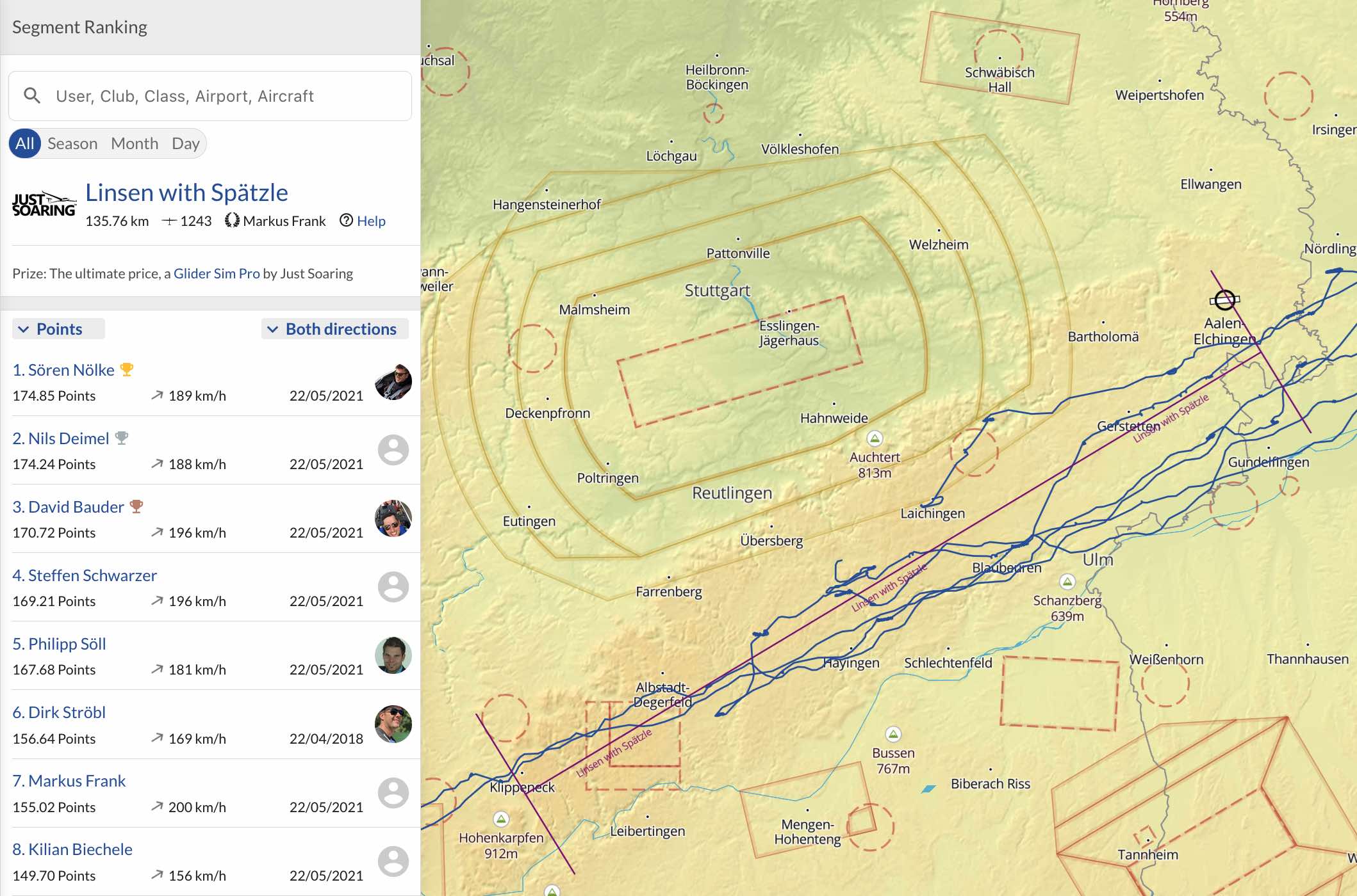 There are some segments with a logo and description of a sponsor. For example, Jonker Sailplanes and SteFly sponsor some cool segments. For the segment on the Swabian Alb, Just Soaring is awarding a full Glider Sim Pro for the fastest pilot of the year.