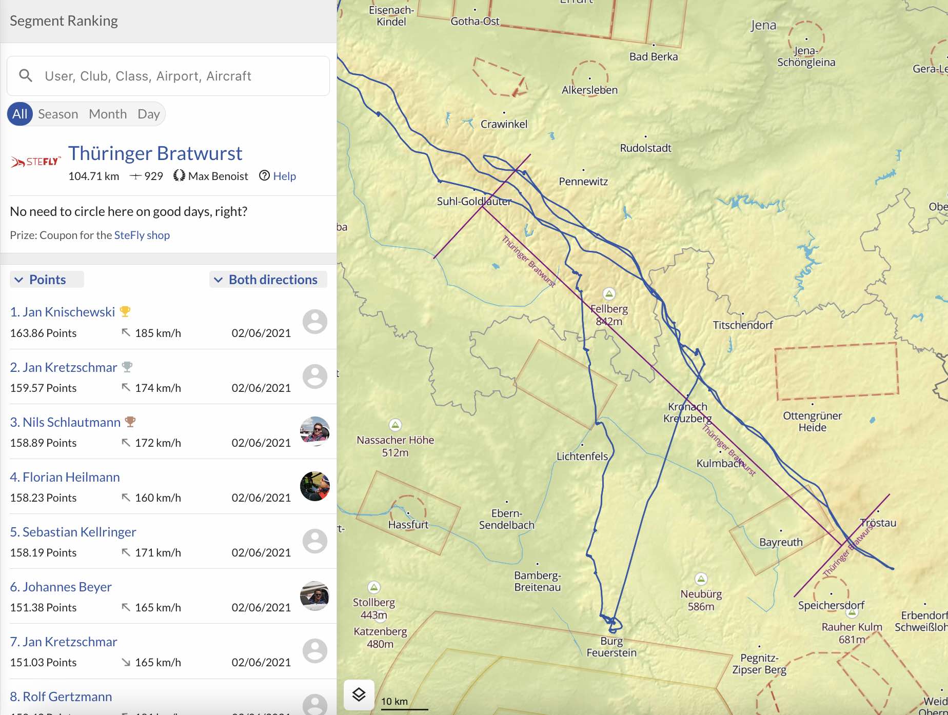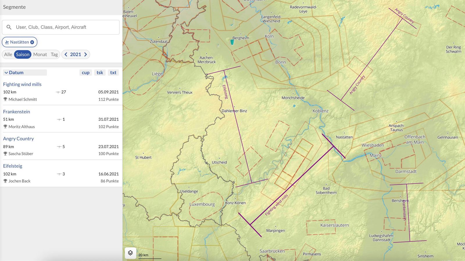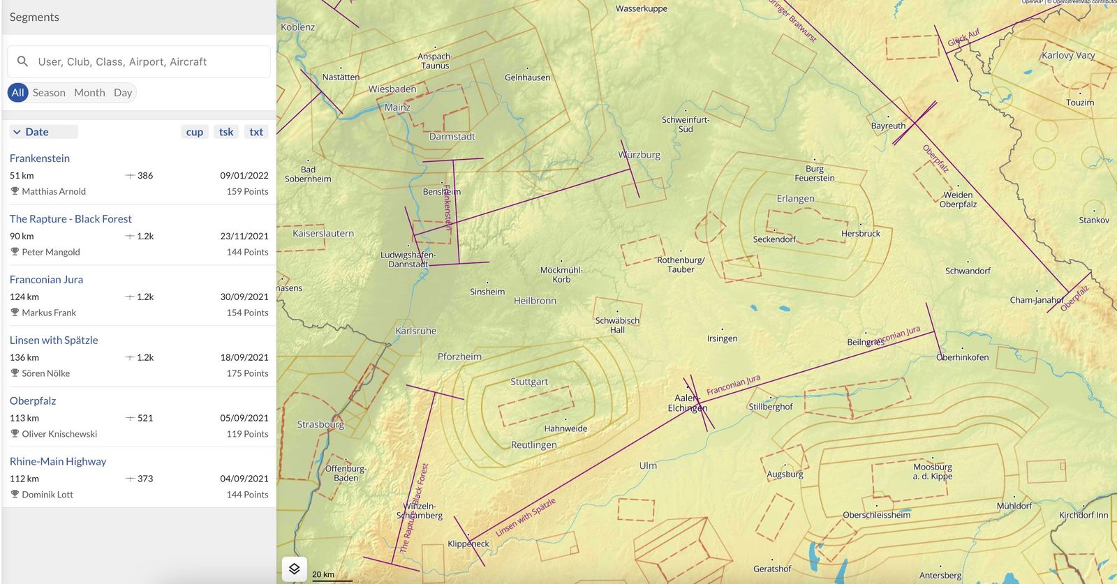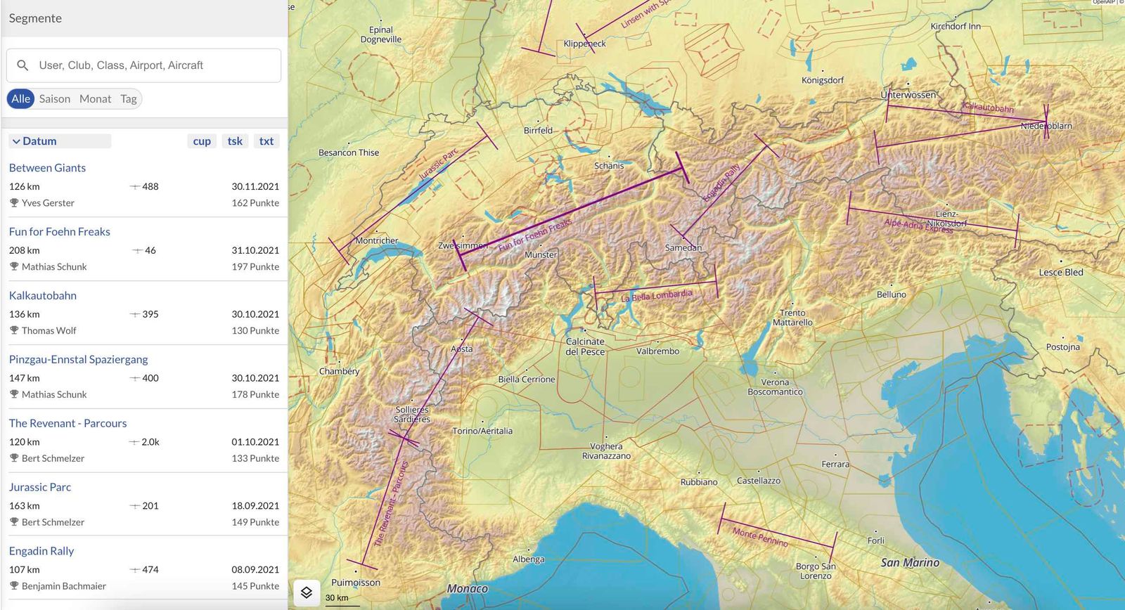 In the segment overview, you will see all existing segments on the map and also in the list. If you zoom in closer, only the segments which are in the map section will be displayed on the list. For every segment, the distance, the number of times the segment has been flown, the last date that the segment has been flown, and the number of points of the winner are shown.