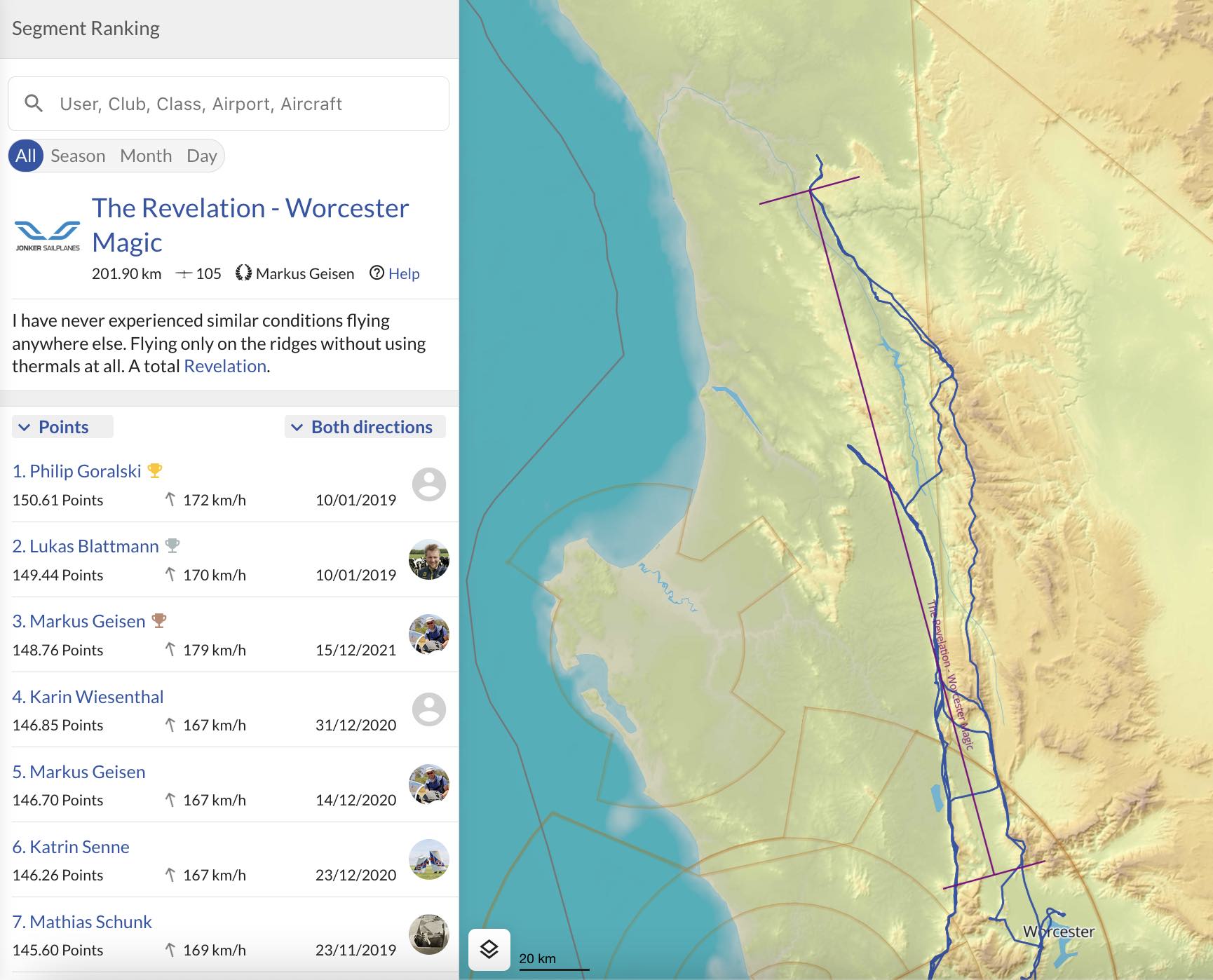 These values adjust to the filters that are set, e.g. if we filter for a club, the aircraft symbol shows the number of times that the segment has been flown by members of the club. The winner behind the trophy is the pilot of the club who has flown the segment the fastest. If we set a filter for a season, the numbers adjust and we see how many time times the segment has been flown in this season and who was the fastest.